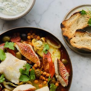 This is one of my go to suppers. Selection of seafood such as Cod, Monkfish and Prawns. With Chickpeas, Lemon and garlic potatoes. All in rich comforting sauce that has all the flavours of the Med and North Africa.