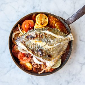 Whole east coast John Dory baked with potatoes, white onion, garlic, tomatoes, saffron, preserved lemon, sumac , harissa & Aron island feta.