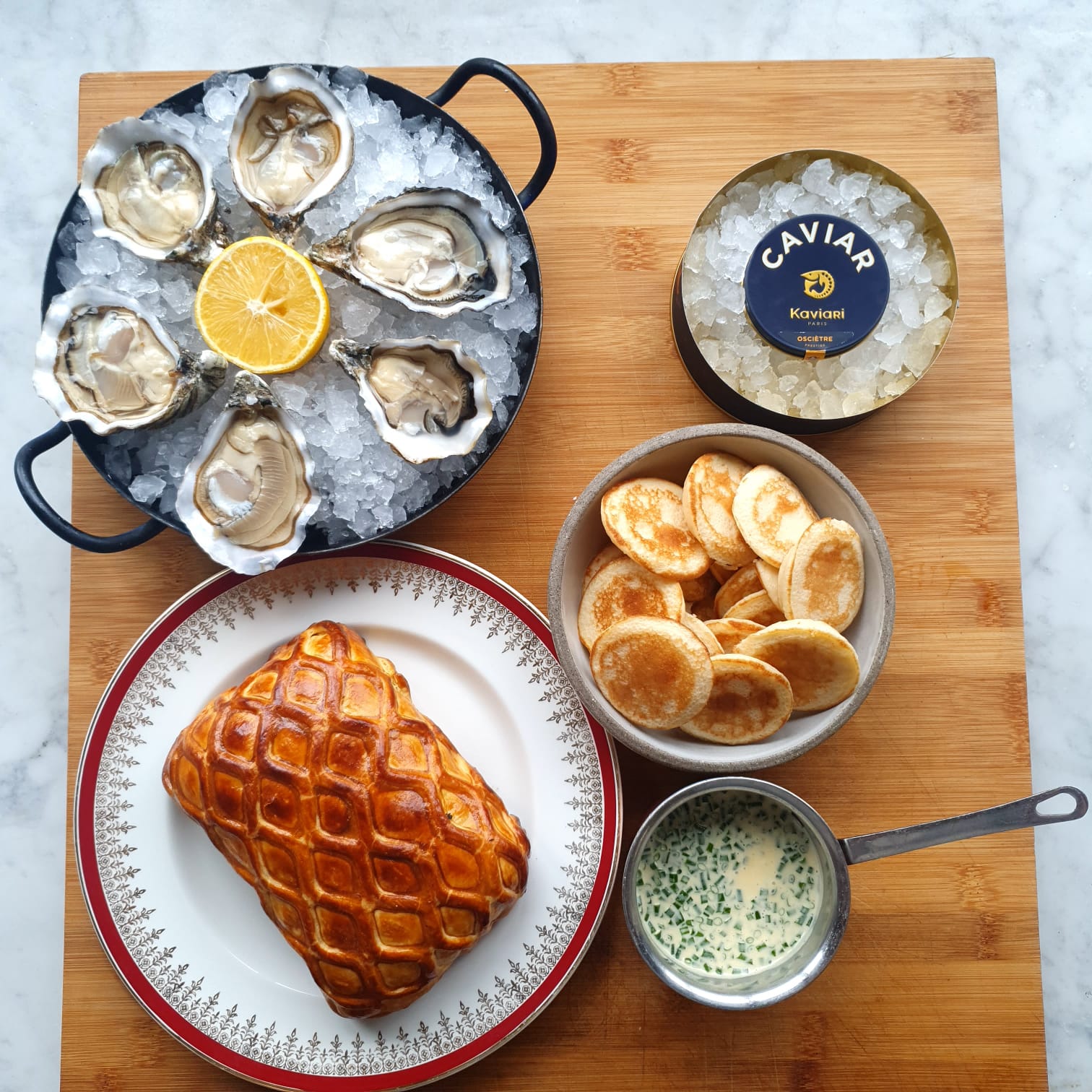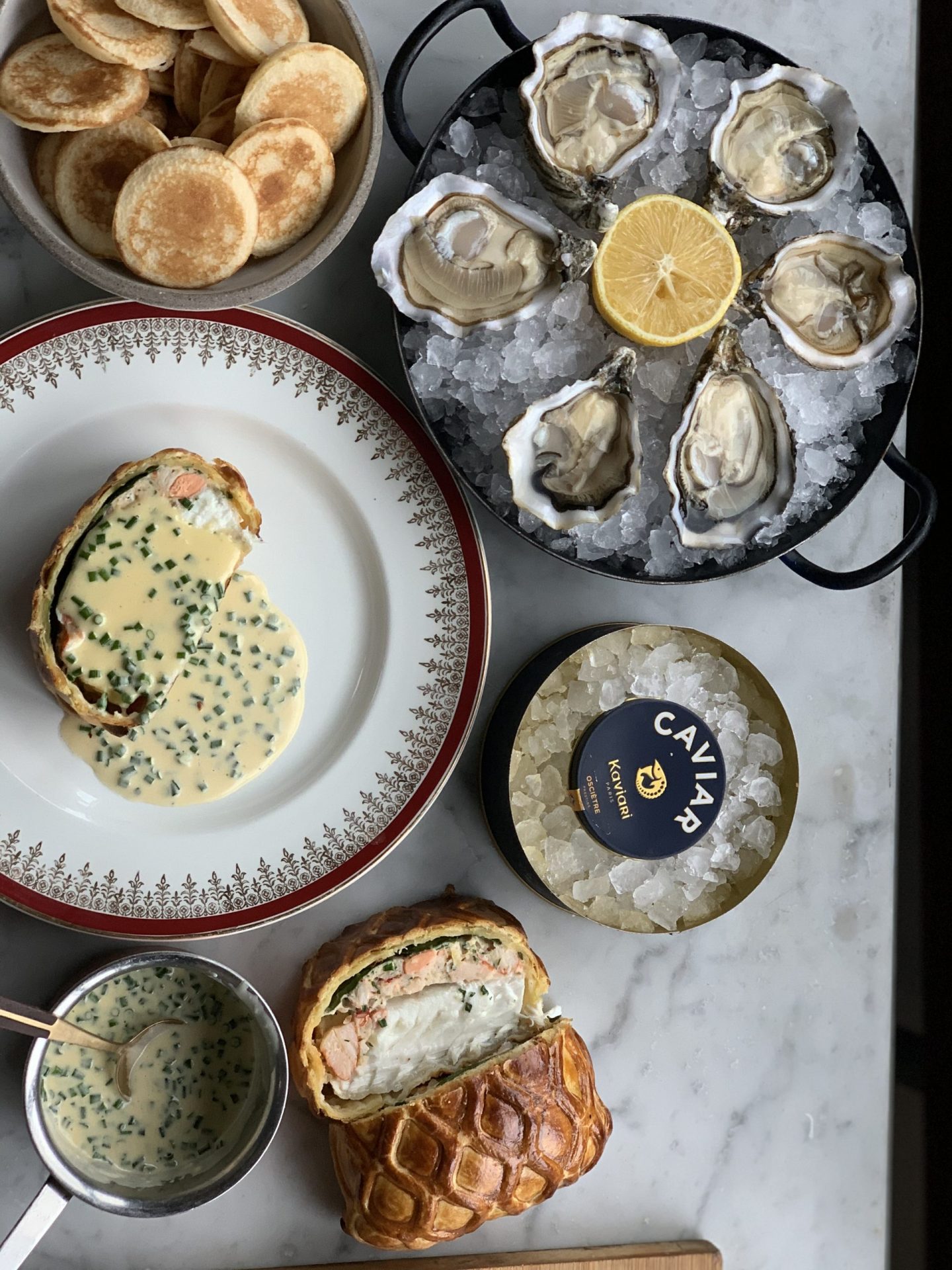 This special feast brings together champagne, oysters, caviar, halibut & lobster en croûte, a champagne butter sauce, and a decadent chocolate opera cake to finish.